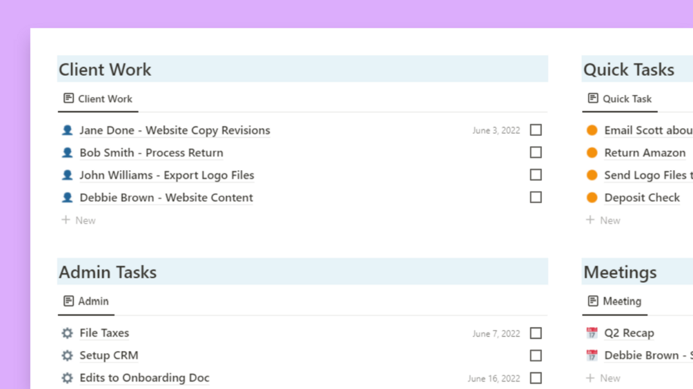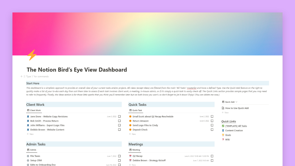 In The Notion BEV Dashboard, each section is filtered by type from a master task list, featuring client interaction tasks, personal admin tasks, meetings, and quick tasks. Client tasks can be changed to feature any task that someone depends on you for, like coworkers, contractors, kids, and more. Use the Quick Add feature on the right to quickly make a list of your to-dos each day then sort them later to assess if each task involves client work, a meeting, in-house admin, or if it’s simply a quick task to easily check off. The Quick Links section provides sample pages that you may need to refer to frequently and the Ideas section is perfect for those little nuggets of genius that could be the next big thing if you only had someplace to jot it down!