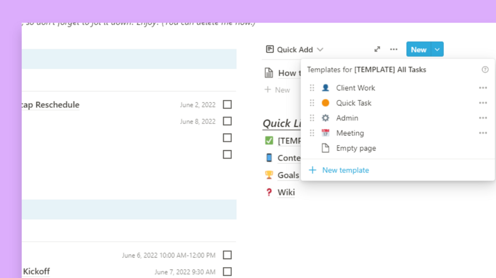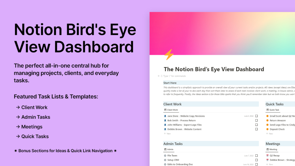 In The Notion BEV Dashboard, each section is filtered by type from a master task list, featuring client interaction tasks, personal admin tasks, meetings, and quick tasks. Client tasks can be changed to feature any task that someone depends on you for, like coworkers, contractors, kids, and more. Use the Quick Add feature on the right to quickly make a list of your to-dos each day then sort them later to assess if each task involves client work, a meeting, in-house admin, or if it’s simply a quick task to easily check off. The Quick Links section provides sample pages that you may need to refer to frequently and the Ideas section is perfect for those little nuggets of genius that could be the next big thing if you only had someplace to jot it down!